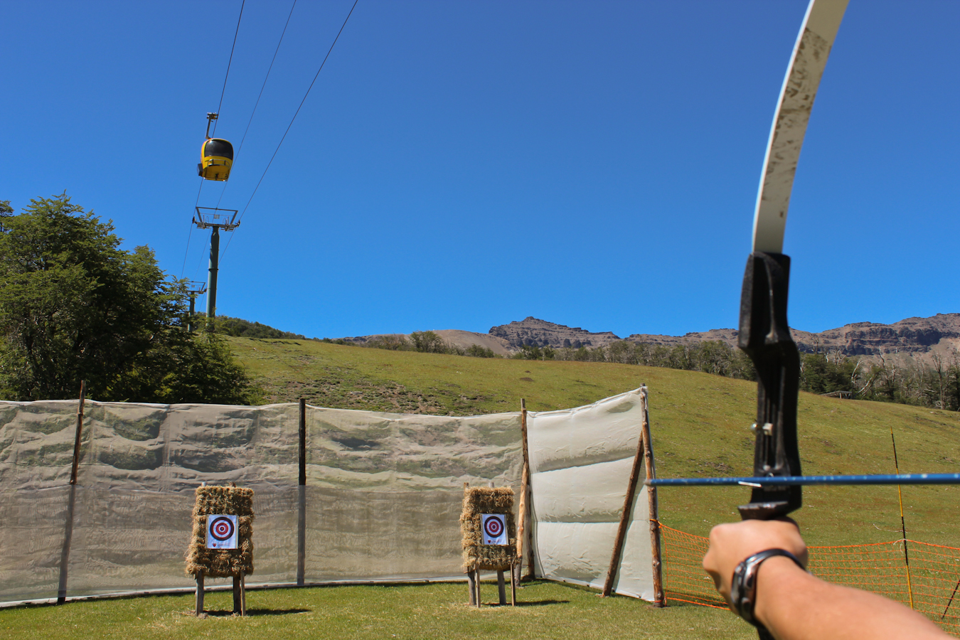 La plataforma de arco y flecha también se encuentra en la Base de Chapelco. La actividad consiste en hacer blanco con 10 intentos, a 15 metros de distancia. El instructor enseña el uso de los arcos que son profesionales y de diferentes libras. Explica como poner la mano, como utilizar la mira del arco, y la tensión que hay que darle. Son 10 oportunidades para darle en el blanco!