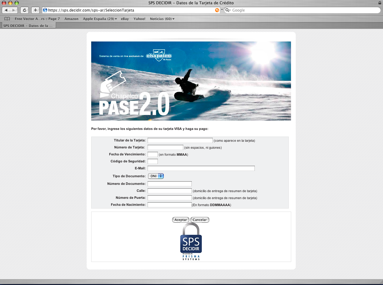La compra se realiza desde el sitio web, a través de una plataforma interactiva sencilla y rápida, que va guiando al usuario en el proceso de compra. Luego del pago con tarjeta de crédito el sistema emite un voucher con todos los datos del comprador, que luego de imprimirlo se canjea en forma rápida en destino. Este sistema permite elegir entre todas las opciones de pases ofrecidos en el tarifario (desde pase diario a pase de temporada), con las tarifas correspondientes de acuerdo al calendario 2013 (temporada baja, especial, media y alta).