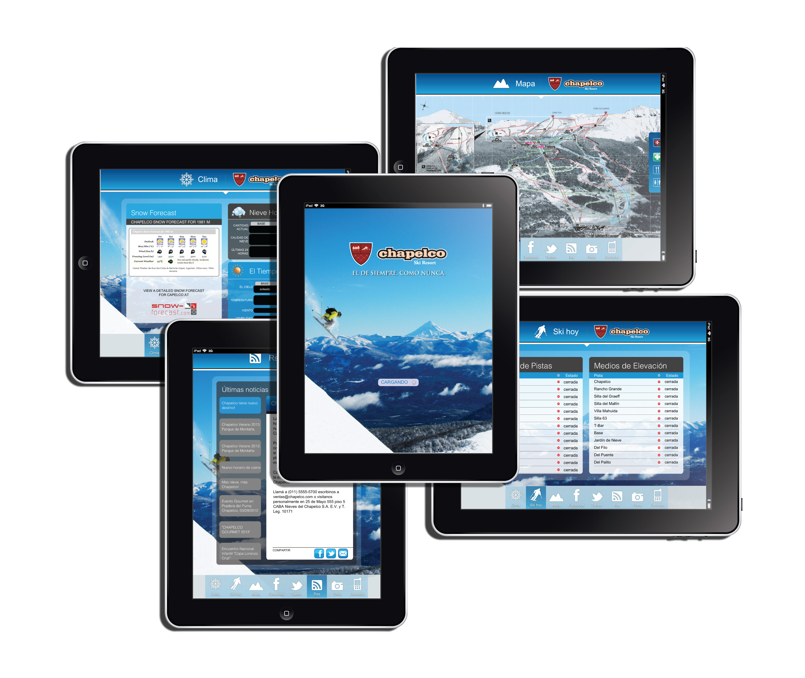 Chapelco continúa marcando el camino de la innovación en el terreno mobile. Por eso, en el 2013 lanza su nueva aplicación para iPad , acercando a una gran cantidad de usuarios de estas tabletas una herramienta que brinda en tiempo real la información meteorológica de Chapelco, su mapas de pistas, medios de elevación, estado del clima, servicios, y actualizaciones con todas las novedades de la temporada. La nueva aplicación ofrece a los usuarios de iPad un espectacular soporte que trabaja a pantalla completa, con la tecnología Apple, que hoy lidera en el mundo en satisfacción de clientes de tabletas. La nueva aplicación puede descargarse en forma gratuita de la plataforma de iTunes App Store. Este desarrollo se suma a las distintas aplicaciones lanzadas en 2012 para iPhones y toda la línea de iPods, Blackberry y dispositivos que utilizan el sistema operativo Android. De esta manera, Chapelco continúa liderando en servicios de comunicación móvil con sus clientes.