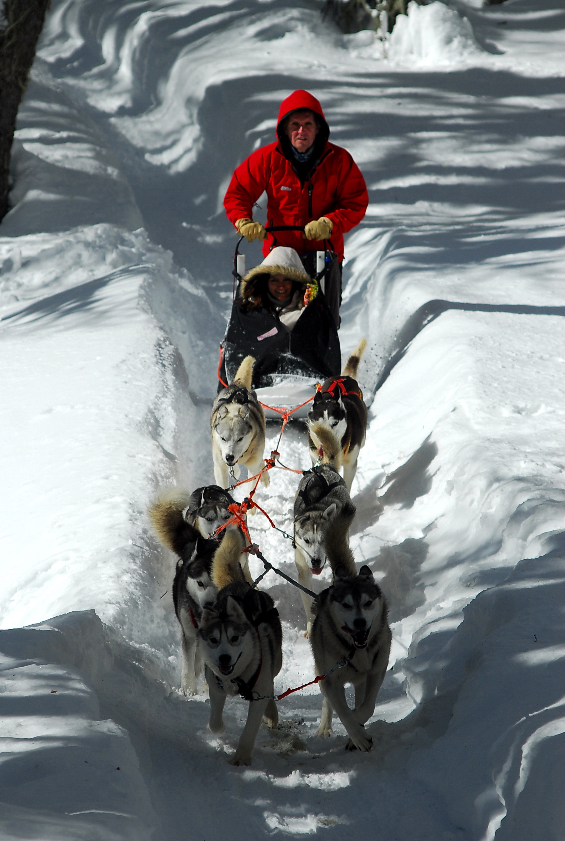 Los trineos de este paseo son tirados por 6 perros. La actividad no es solo salir a dar una vuelta en un trineo, sino que intenta recrear y hacer vivir a los participantes antiguas formas de vivir en las zonas más remotas del mundo. Los trineos en su origen eran utilizados como medio de transporte por los habitantes de las tierras más frías del planeta. Aunque no se sabe exactamente desde qué año, los esquimales usaron a sus perros, descendientes del lobo ártico, para viajar a través de la nieve.
