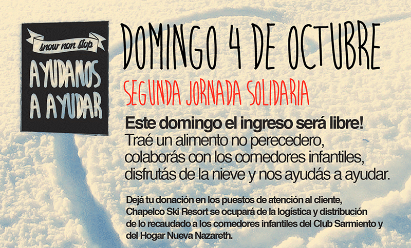 Chapelco Ski Resort invita a todos a compartir mañana domingo 4 de octubre un día de esquí libre y solidario. El acceso al Cerro Chapelco será libre para todos quienes deseen concurrir a disfrutar de la nieve. A su vez, aportando un alimento no perecedero que se entregará en la base, estaremos todos colaborando con los comedores infantiles del Club Sarmiento y del Hogar Nueva Nazaret.