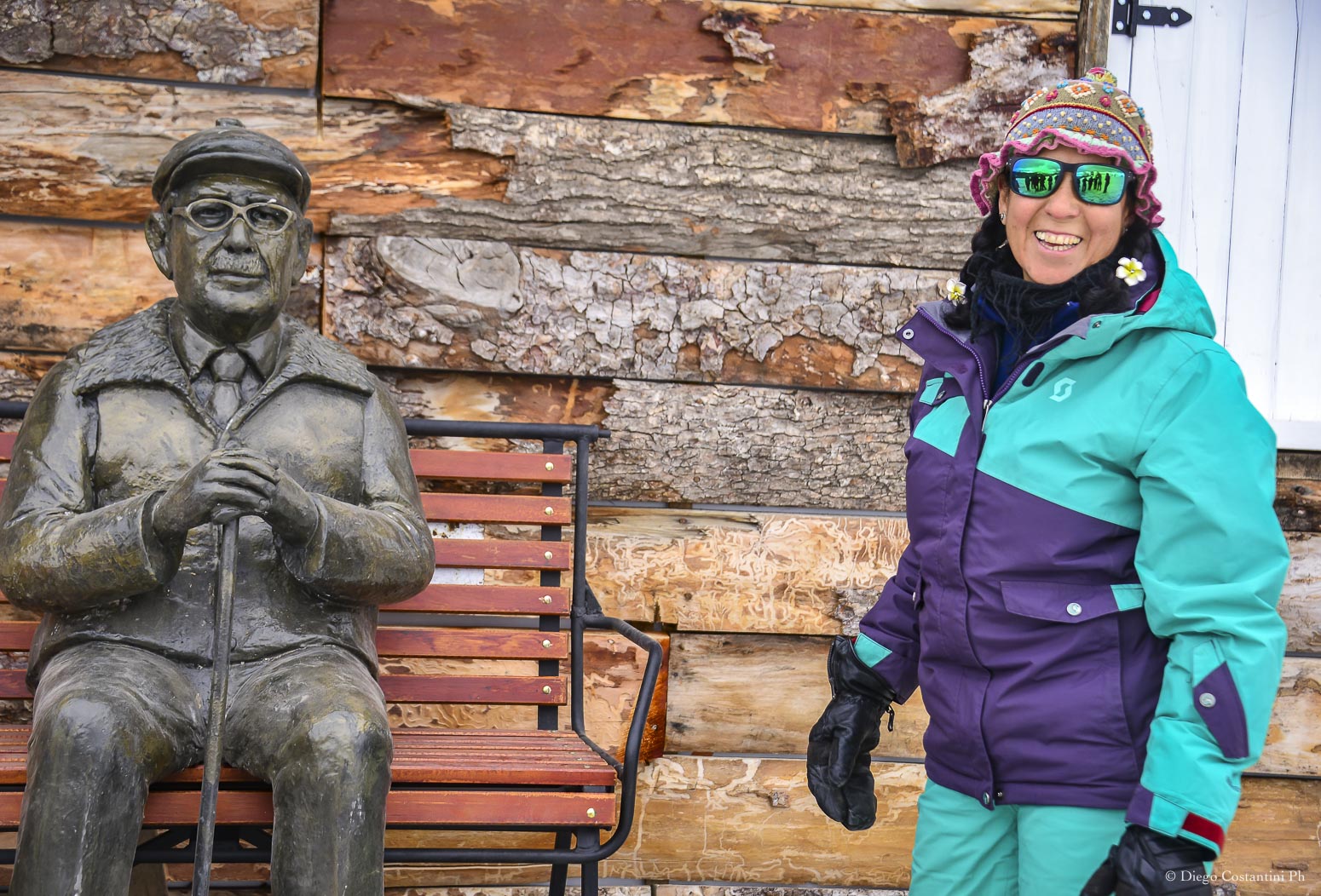 Ante la presencia de la hija menor de Don Américo, Verónica Astete instructora de la Escuela de Esquí Chapelco, se instaló la obra frente al histórico y renovado Refugio Graef, construido e inaugurado en 1948 por un grupo de pioneros, donde se refugiaban durante la noche para esquiar en nieve fresca desde la mañana siguiente. Ubicada en plataforma 1700m en el corazón de Chapelco, la impactante imagen de Américo Astete lo muestra sentado en su silla, con las manos apoyadas en su bastón custodiando el refugio, con la mirada hacia el Volcán Lanín.