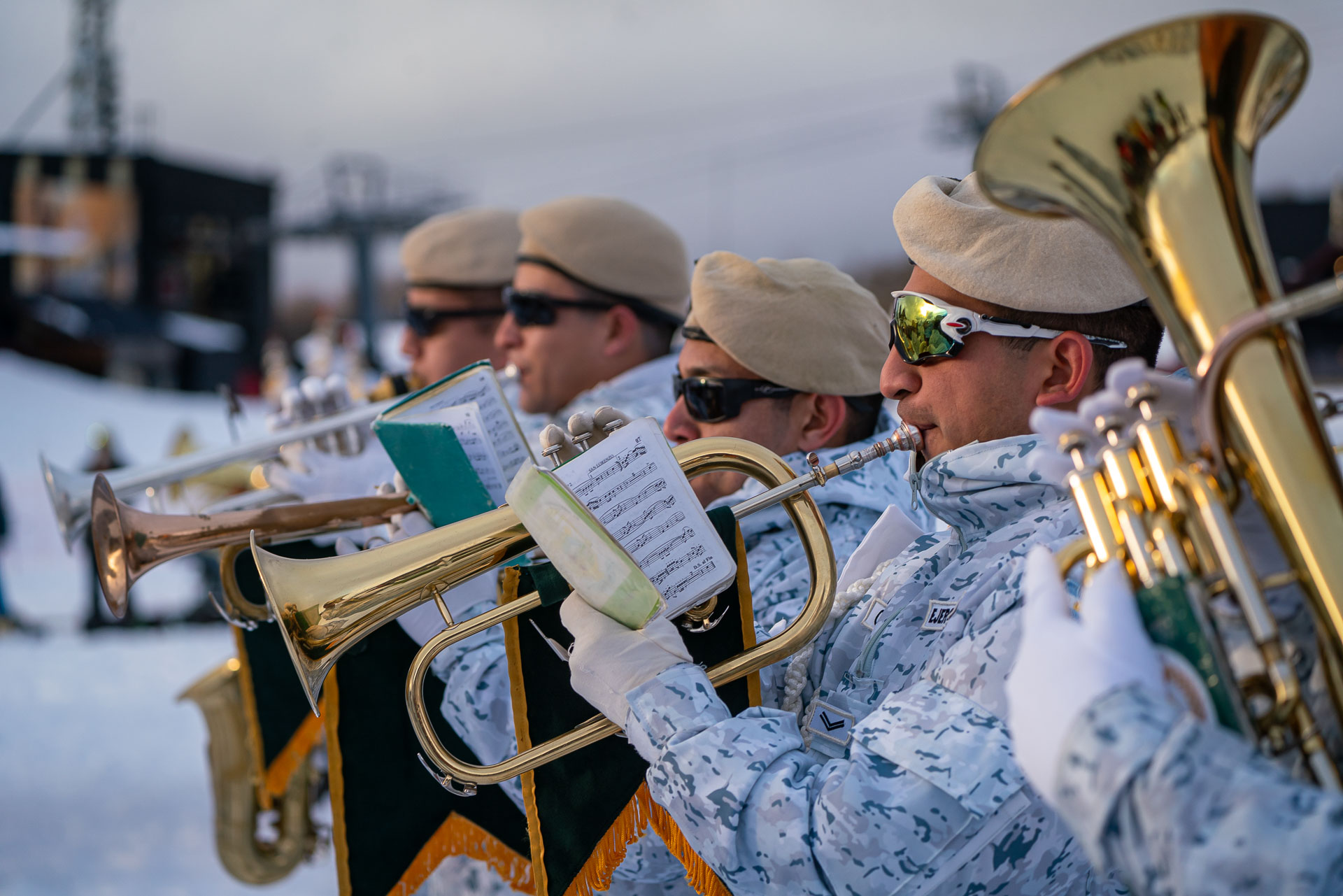 La fanfarria militar “El Hinojal”, una de las cuatro fanfarrias montadas que quedan en el mundo, y la más austral de ellas, junto a la banda Militar de Combate del Chimehuín, le pusieron la música y el brillo al comienzo de esta fiesta en la que no faltó el chocolate y vino caliente, típicos de esta celebración.
