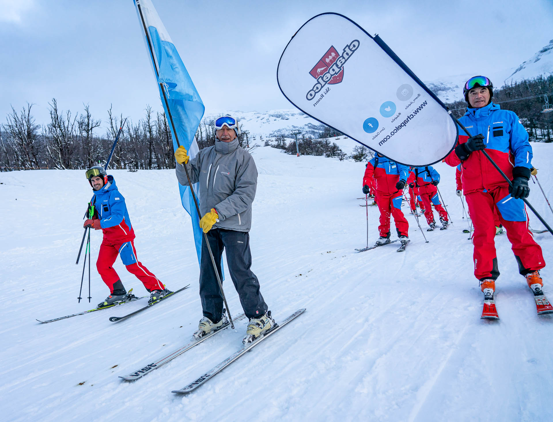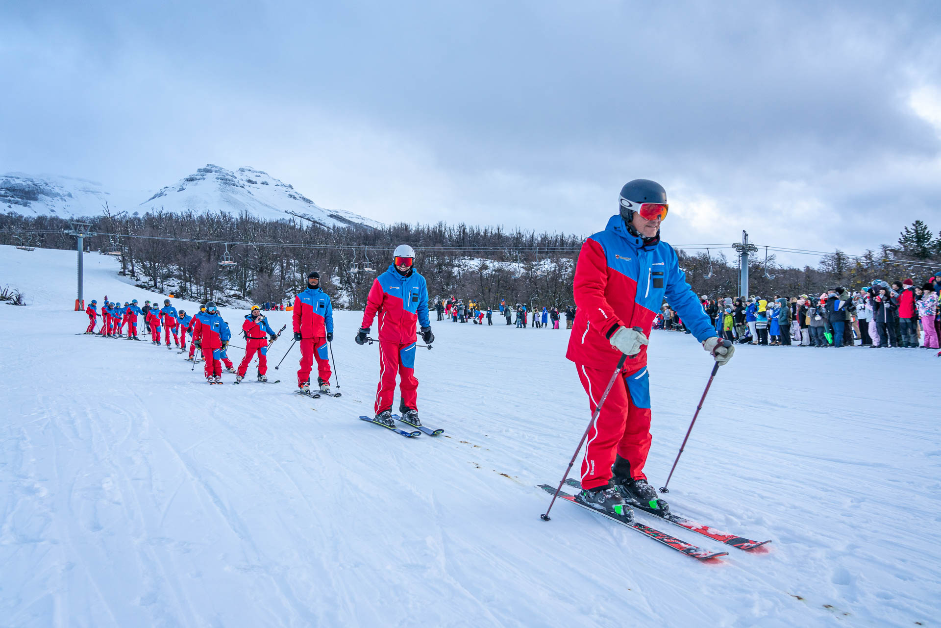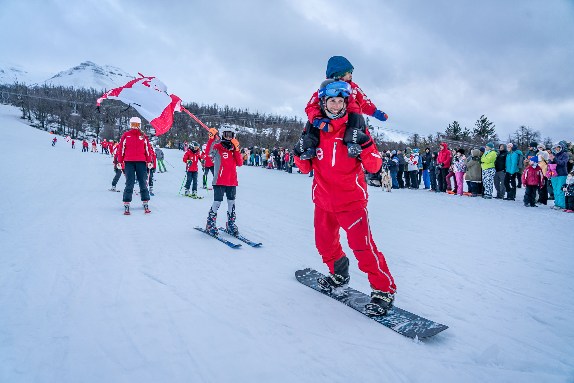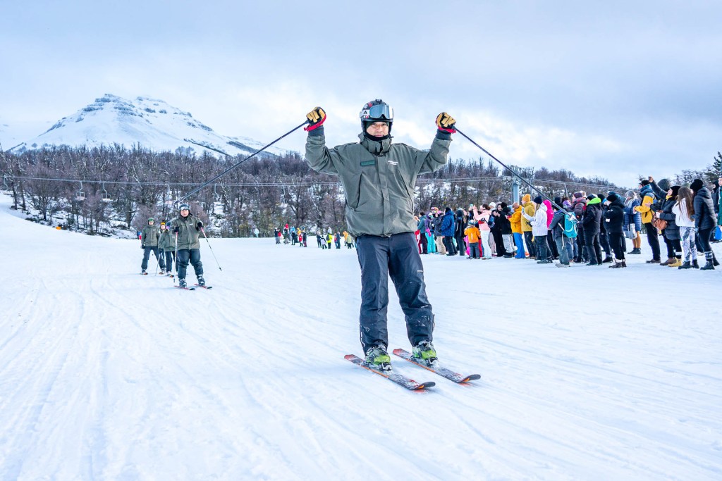 A continuación, con gran entusiasmo de los participantes y del público, abrió el desfile cívico la delegación de los instructores de la Escuela de Esquí y Snowboard de Chapelco, realizando algunas demostraciones de técnica y de sincro, llevando como abanderado a Héctor Gringo Reviriego, histórico y reconocido instructor de esquí que participó en los orígenes de esta escuela, cumpliendo una amplia trayectoria hasta hoy. La Escuela de Esquí Adaptado impactó en su descenso demostrando la técnica con la cual se enseña el esquí y snowboard a personas con discapacidades.