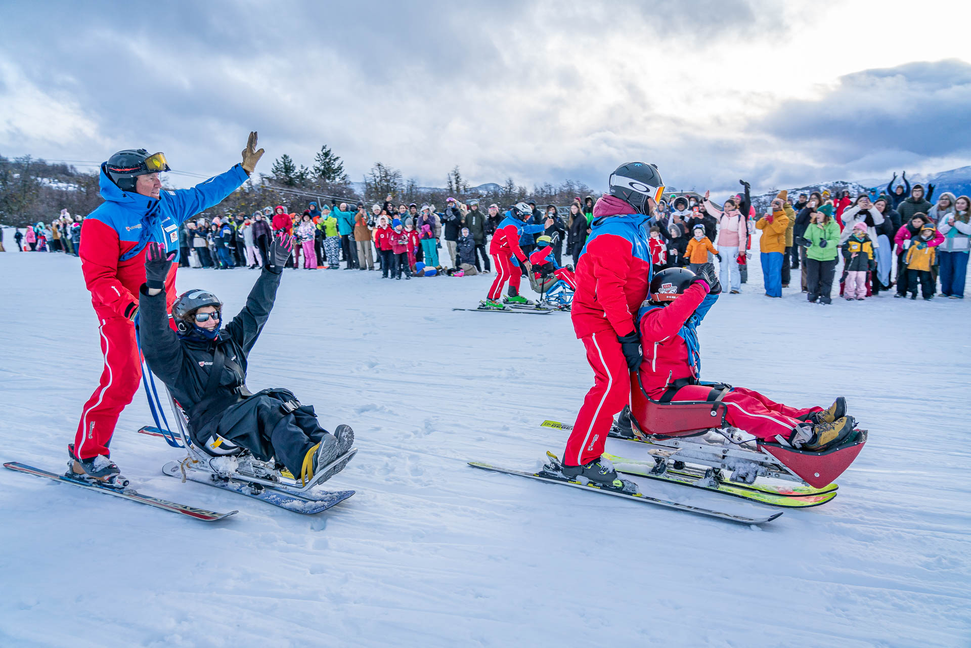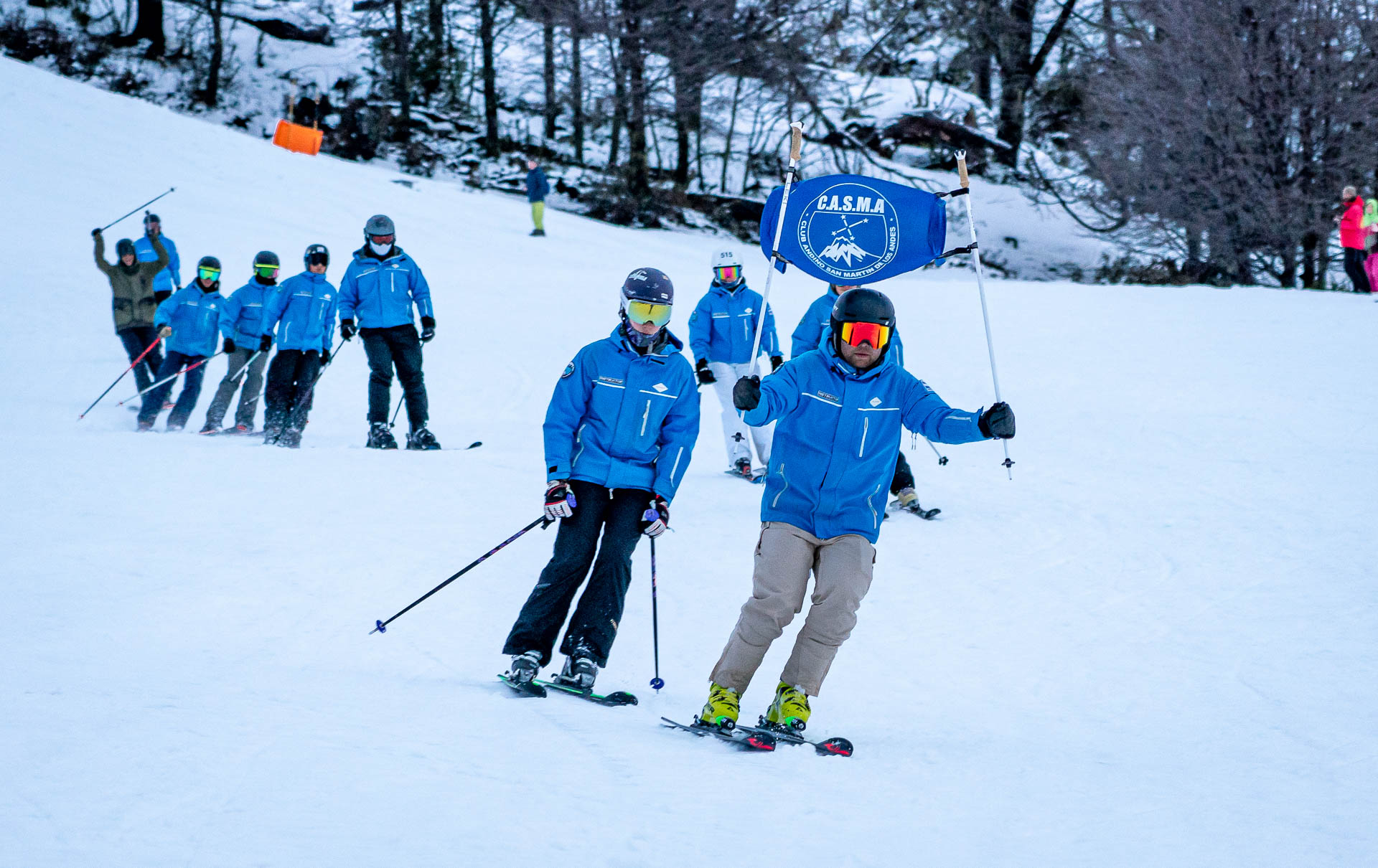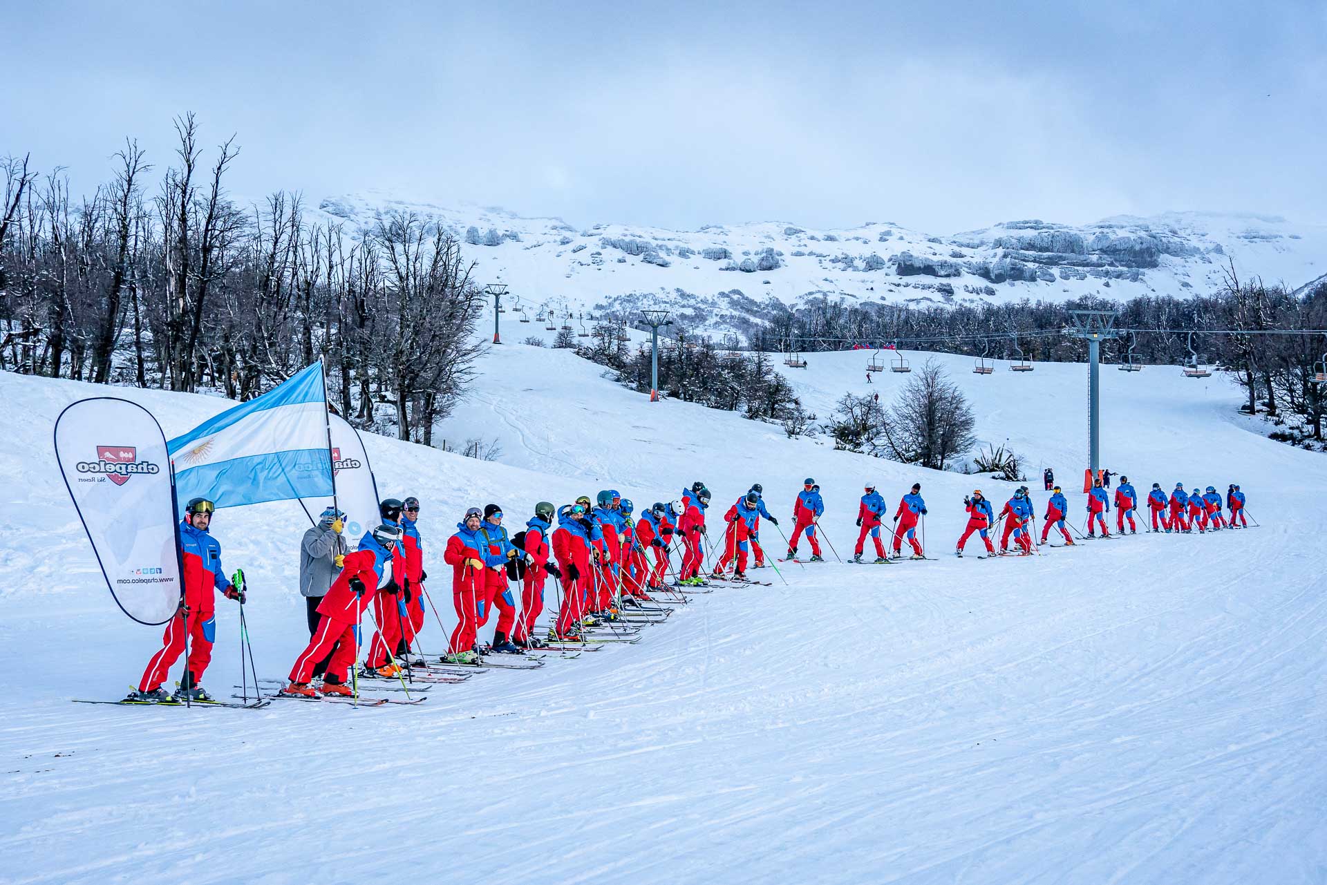 A continuación, con gran entusiasmo de los participantes y del público, abrió el desfile cívico la delegación de los instructores de la Escuela de Esquí y Snowboard de Chapelco, realizando algunas demostraciones de técnica y de sincro, llevando como abanderado a Héctor Gringo Reviriego, histórico y reconocido instructor de esquí que participó en los orígenes de esta escuela, cumpliendo una amplia trayectoria hasta hoy. La Escuela de Esquí Adaptado impactó en su descenso demostrando la técnica con la cual se enseña el esquí y snowboard a personas con discapacidades.