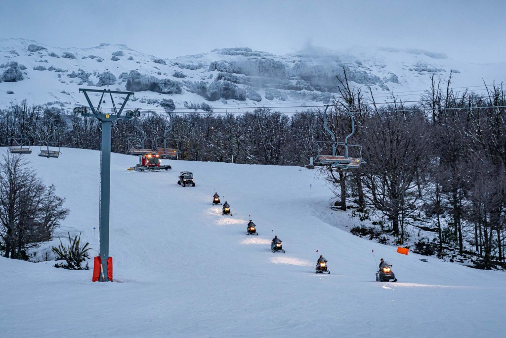 Cerraron la demostración las clásicas y llamativas motos de nieve de Snow Trip que otorgan a los turistas la posibilidad de recorrer los bosques de lengas de Chapelco a 1600m de altura, manejando su propia moto.