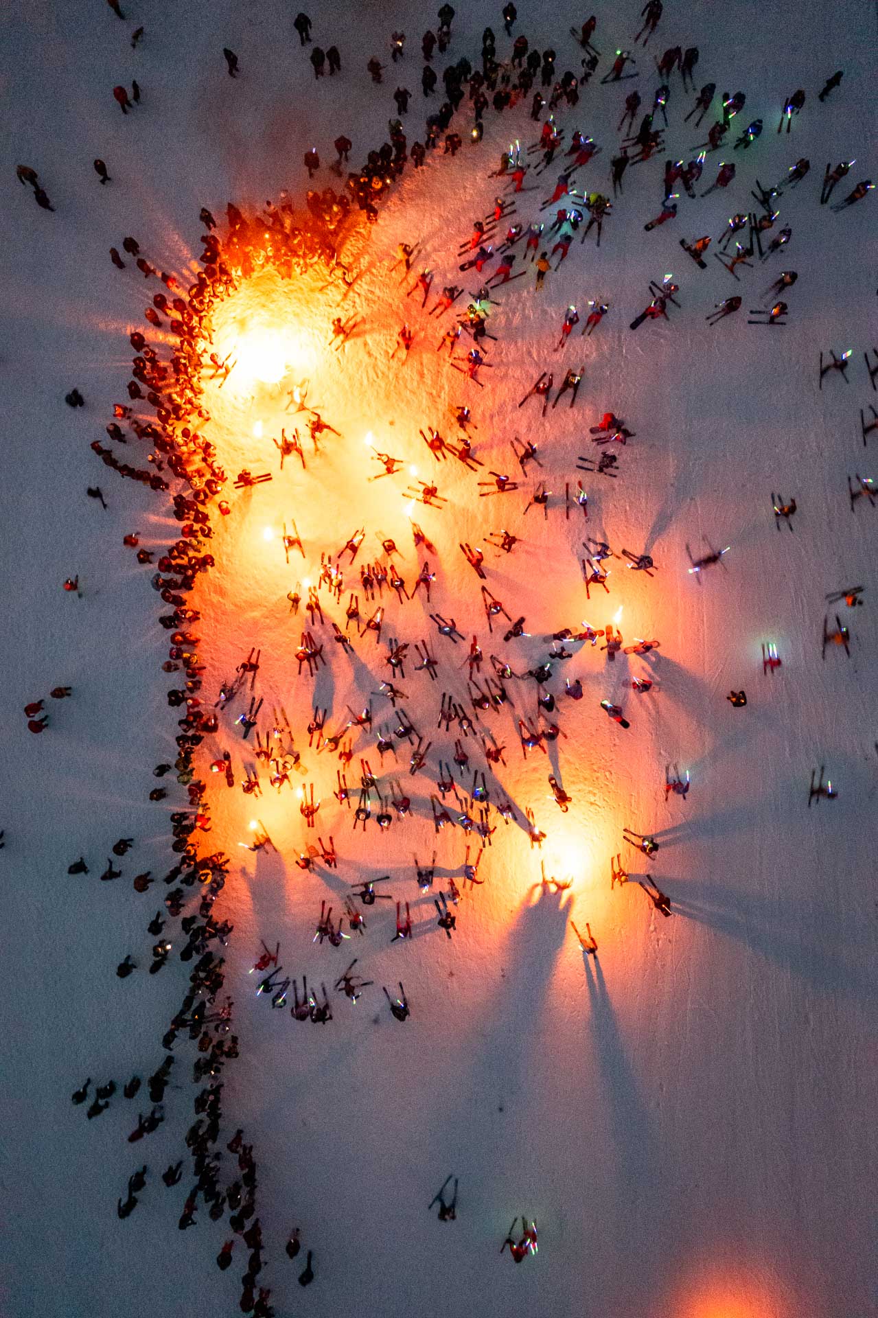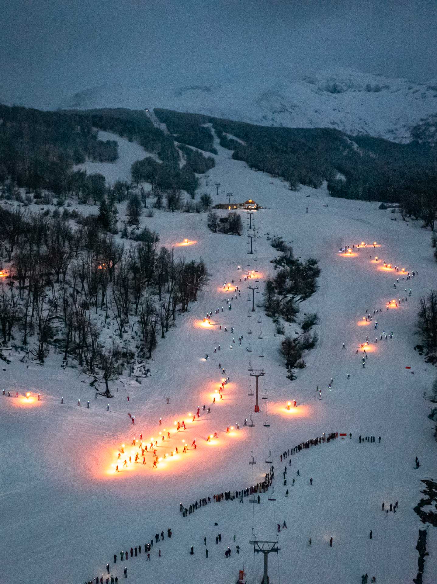 Los participantes, grandes y chicos, personal de Chapelco, pioneros y público en general, participaron de este emocionante evento cargando alternadamente antorchas y luces led, coordinados por personal de cerro que descendieron en diferentes columnas serpenteantes, para finalmente encender el fogón del montañés.